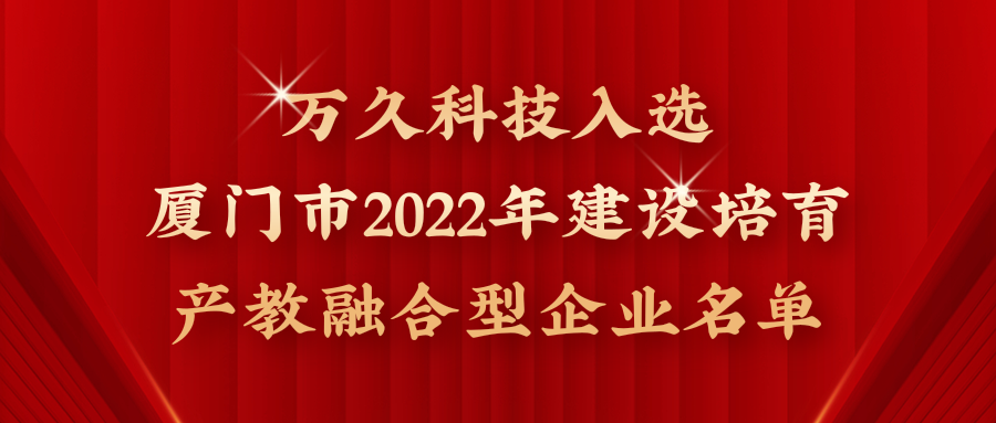 2023年1月18日,厦门市发展和改革委员会等四部门关于发布厦门市2022年建设培育产教融合型企业名单的通知,厦门万久科技股份有限公司成功获批入选厦门市2022年建设培育产教融合型企业名单。
